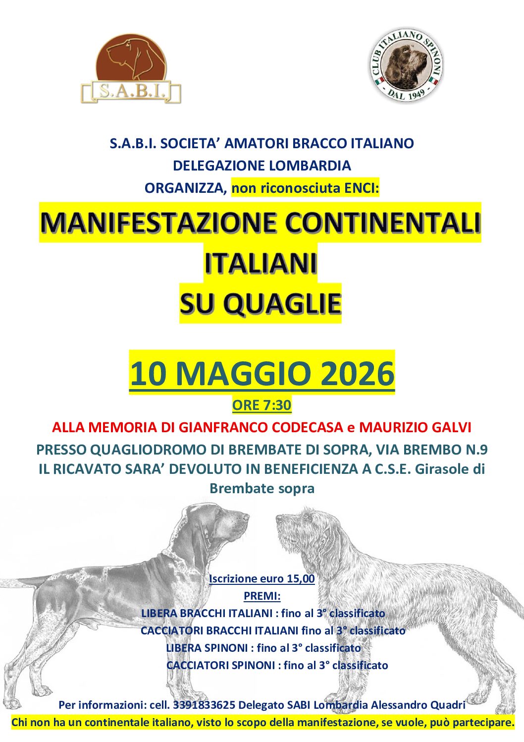 La S.A.B.I. – Delegazione Lombardia, in collaborazione con il Club Italiano Spinoni, è lieta di invitarvi domenica 10 maggio 2026 presso il Quagliodromo di Brembate di Sopra, Via Brembo n. 9 per una giornata speciale dedicata alla passione per i nostri ausiliari e alla solidarietà.